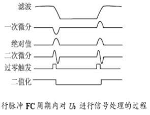 在每个行脉冲FC周期内对U。进行信号处理,过程如图3所示。讲U。信号通过低通滤波电路,滤去高频干扰,对U。进行一次微分边界分离,然后通过绝对值电路将信号进行一致化处理便于进行二次微分,接着进行二次微分以提高分辨率,然后通过过零检测电路找到测量中心,最后进行二值化处理为后续的脉冲技术做好准备。